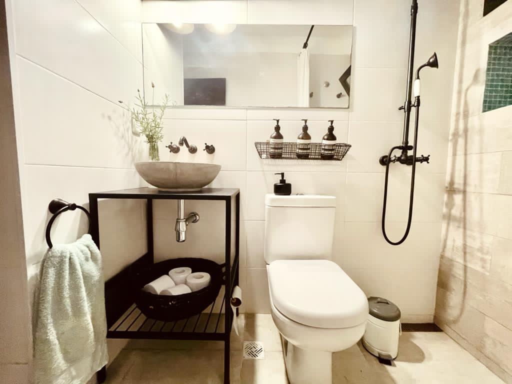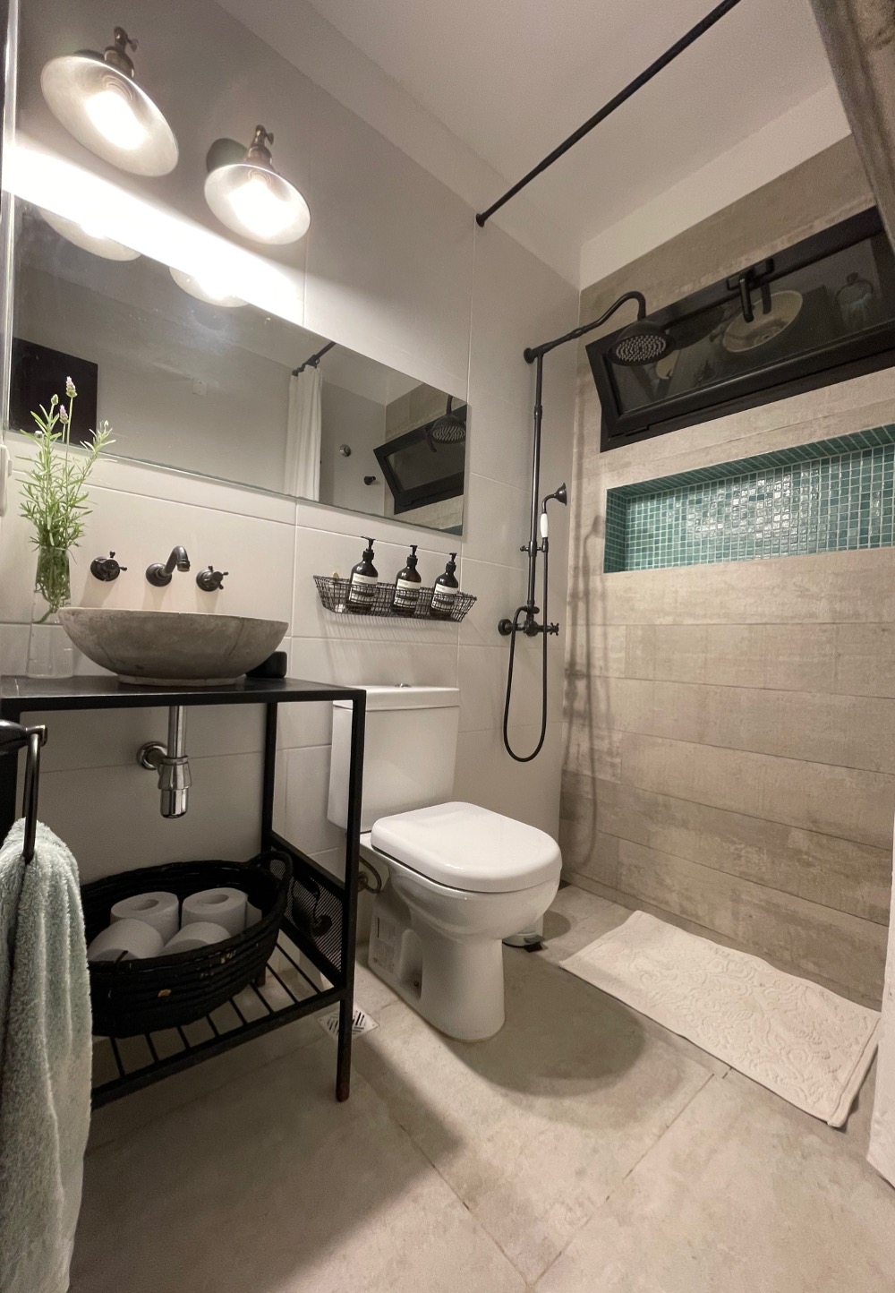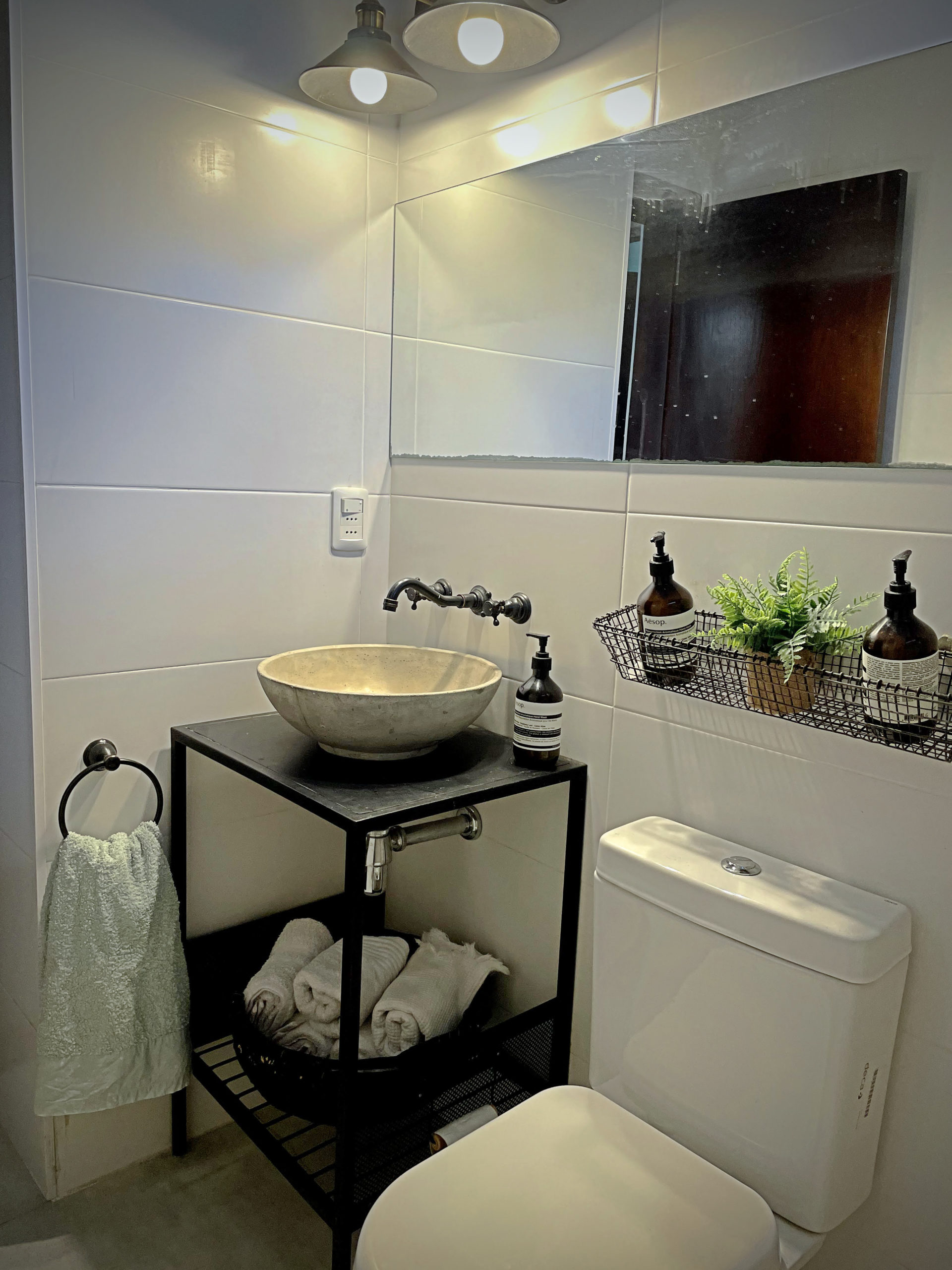 Se buscó renovar el baño social utilizando tonos grises con detalles negros, materiales tales como el hierro con el fin de incorporar un estilo moderno e industrial.