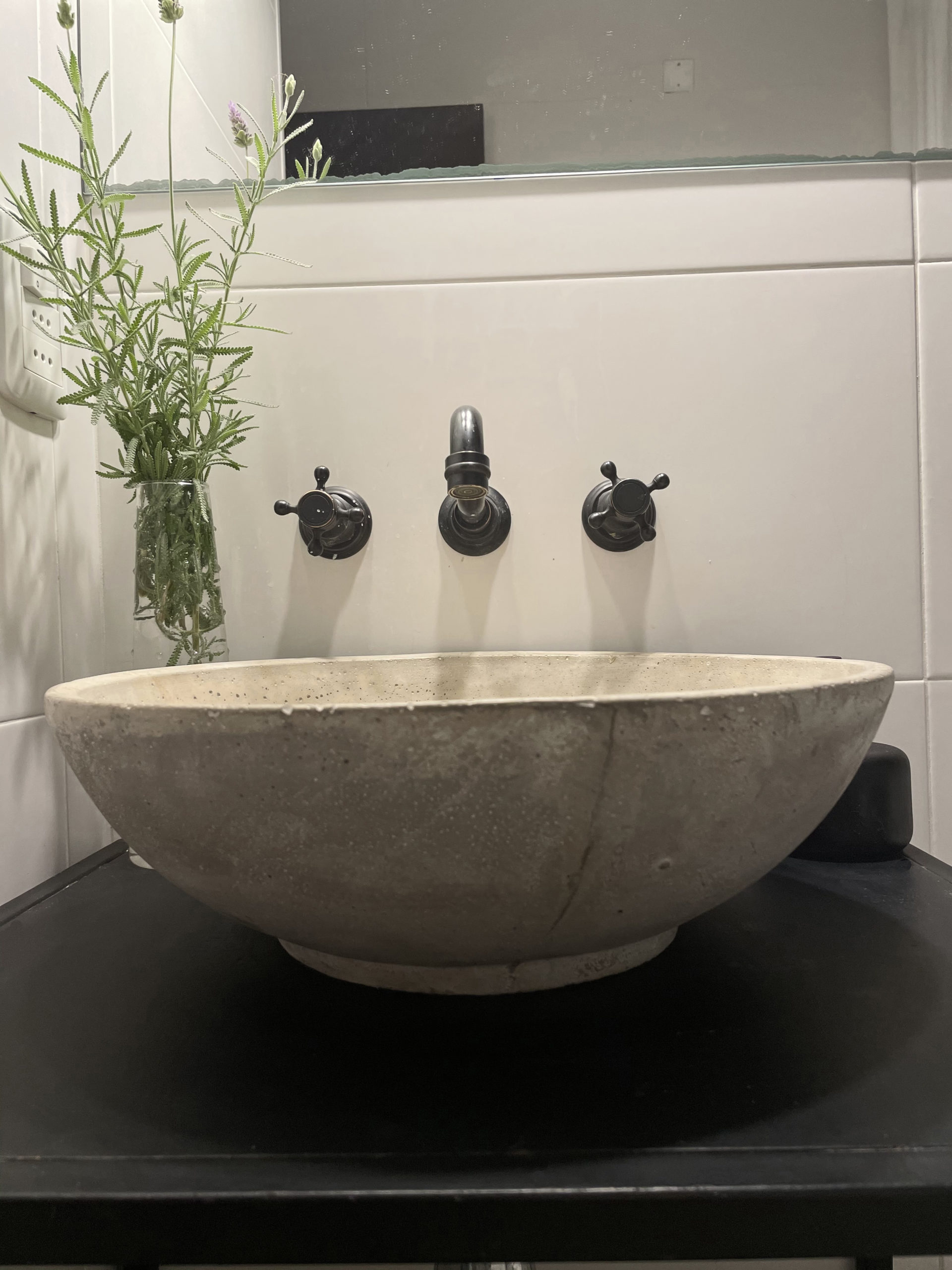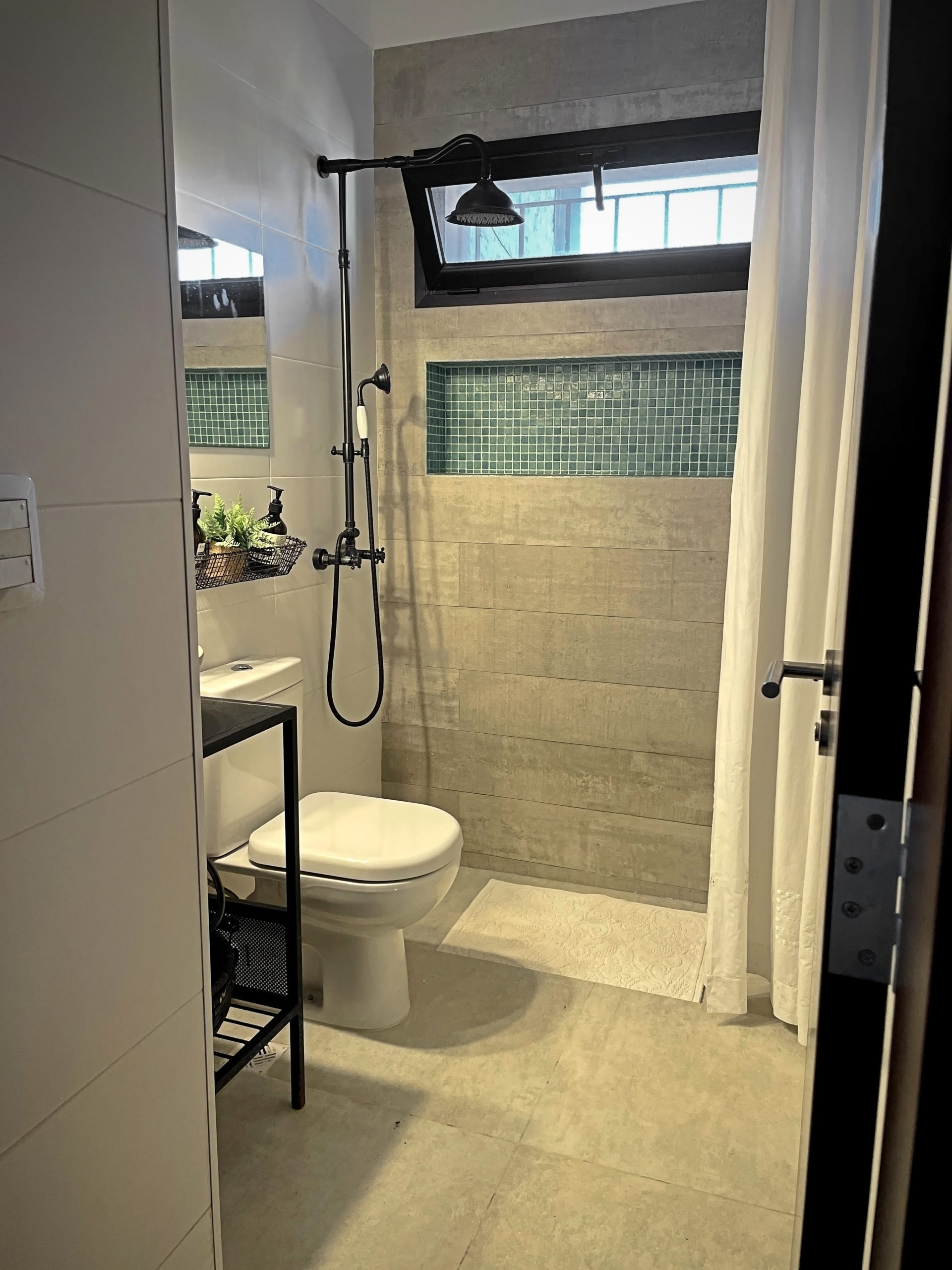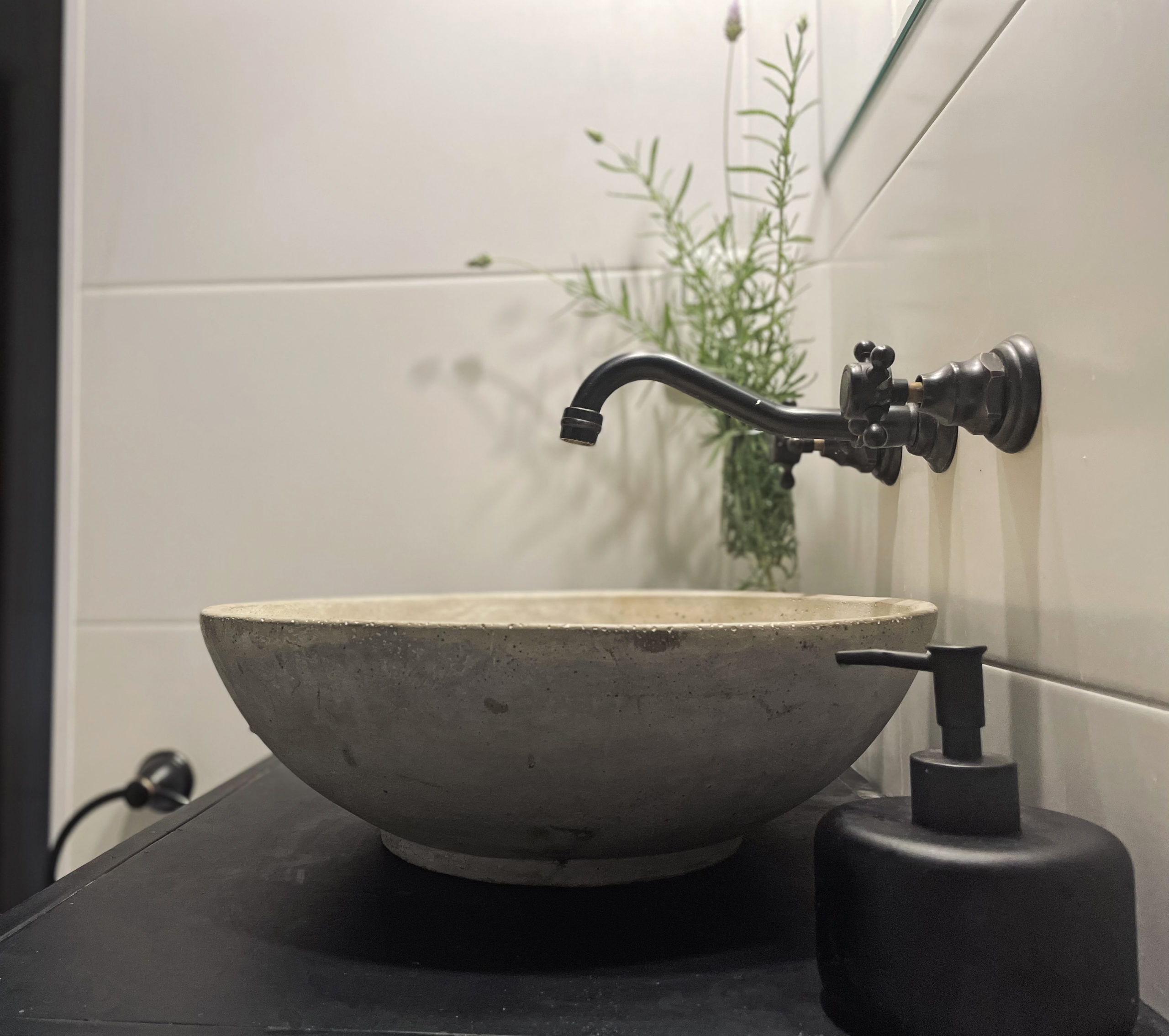 Se buscó renovar el baño social utilizando tonos grises con detalles negros, materiales tales como el hierro con el fin de incorporar un estilo moderno e industrial.