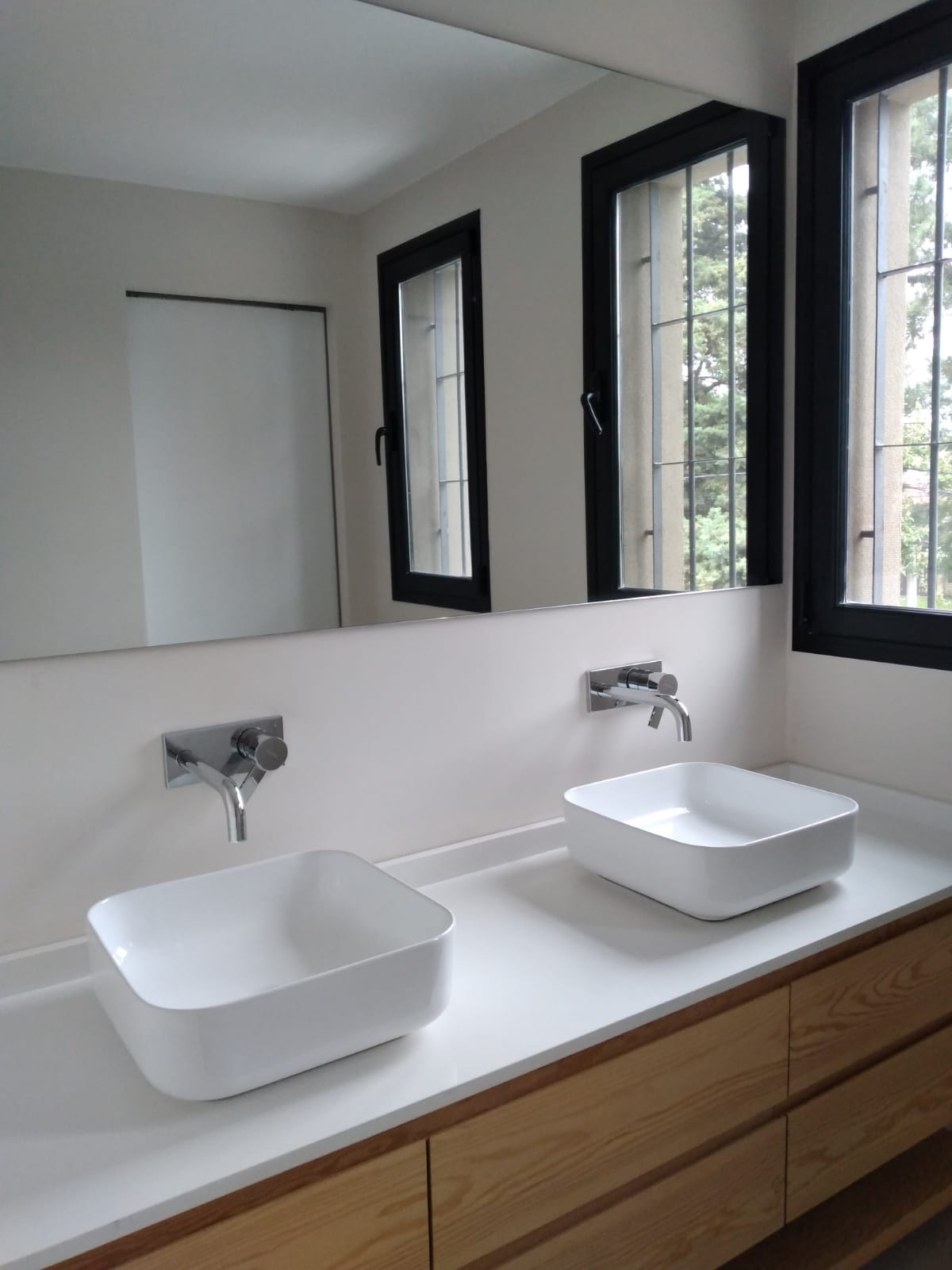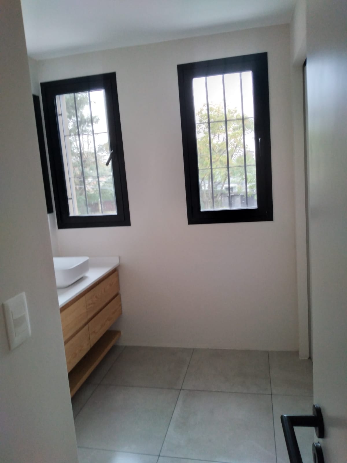 En el baño se jugo con materiales cálidos como la madera, pero simultáneamente con tonos fríos como el gris del porcelanato.