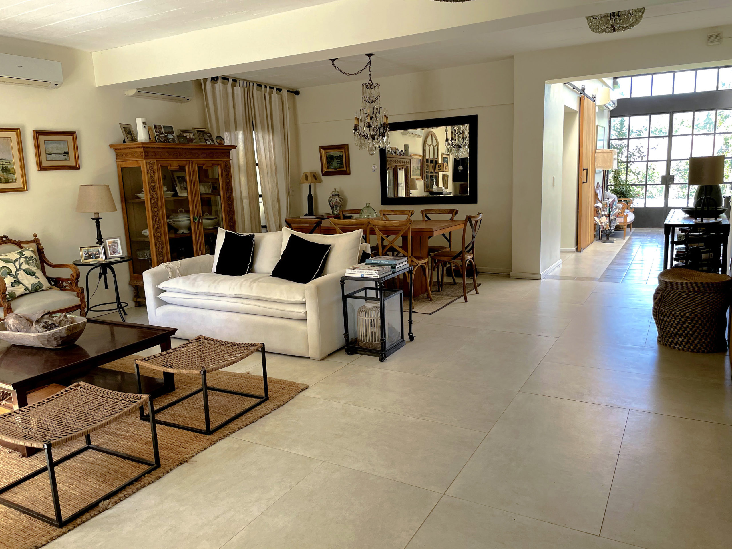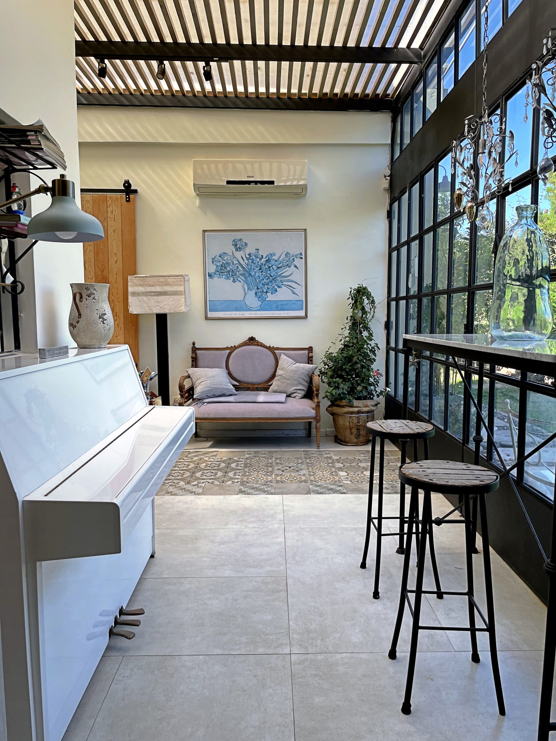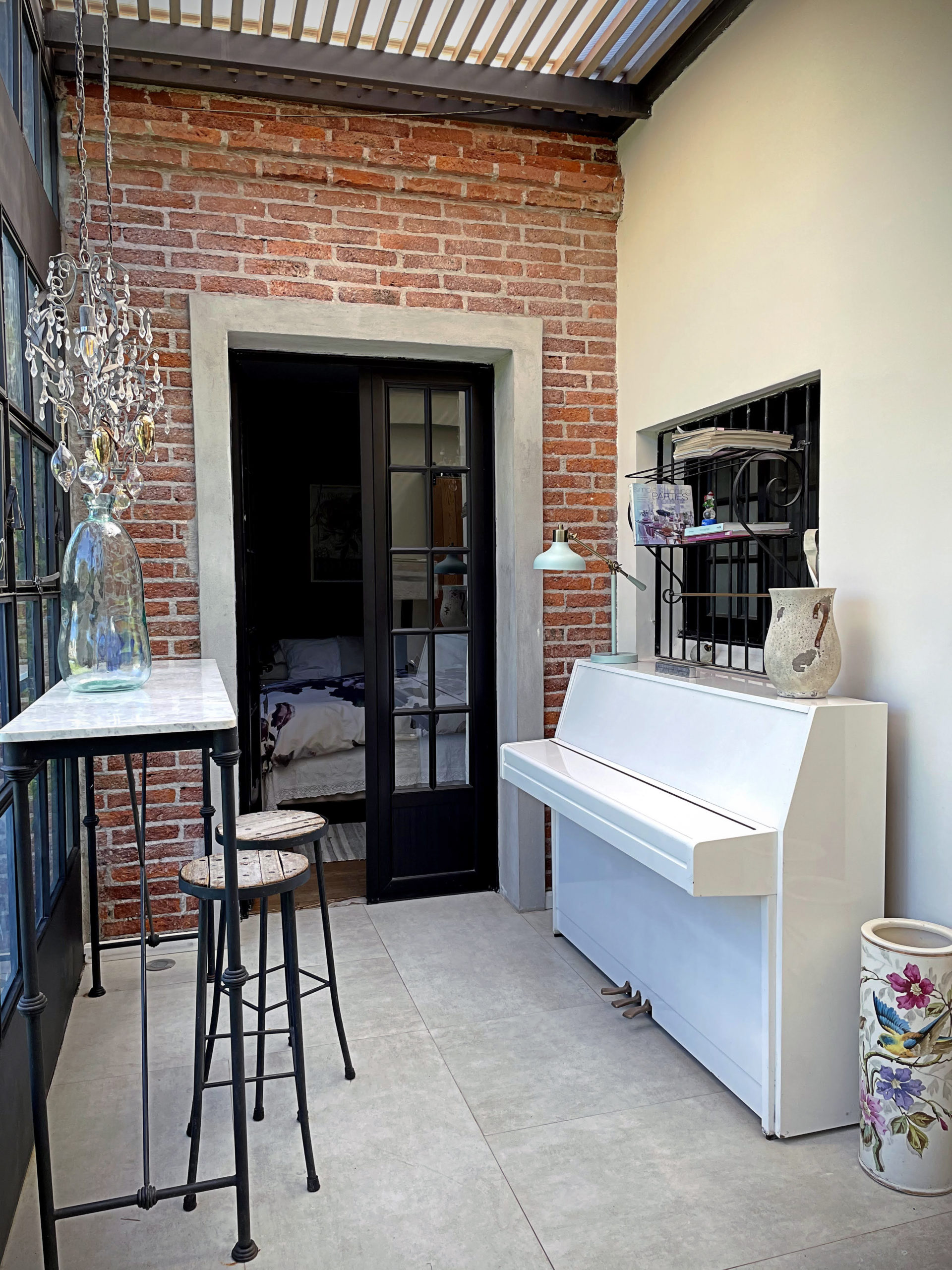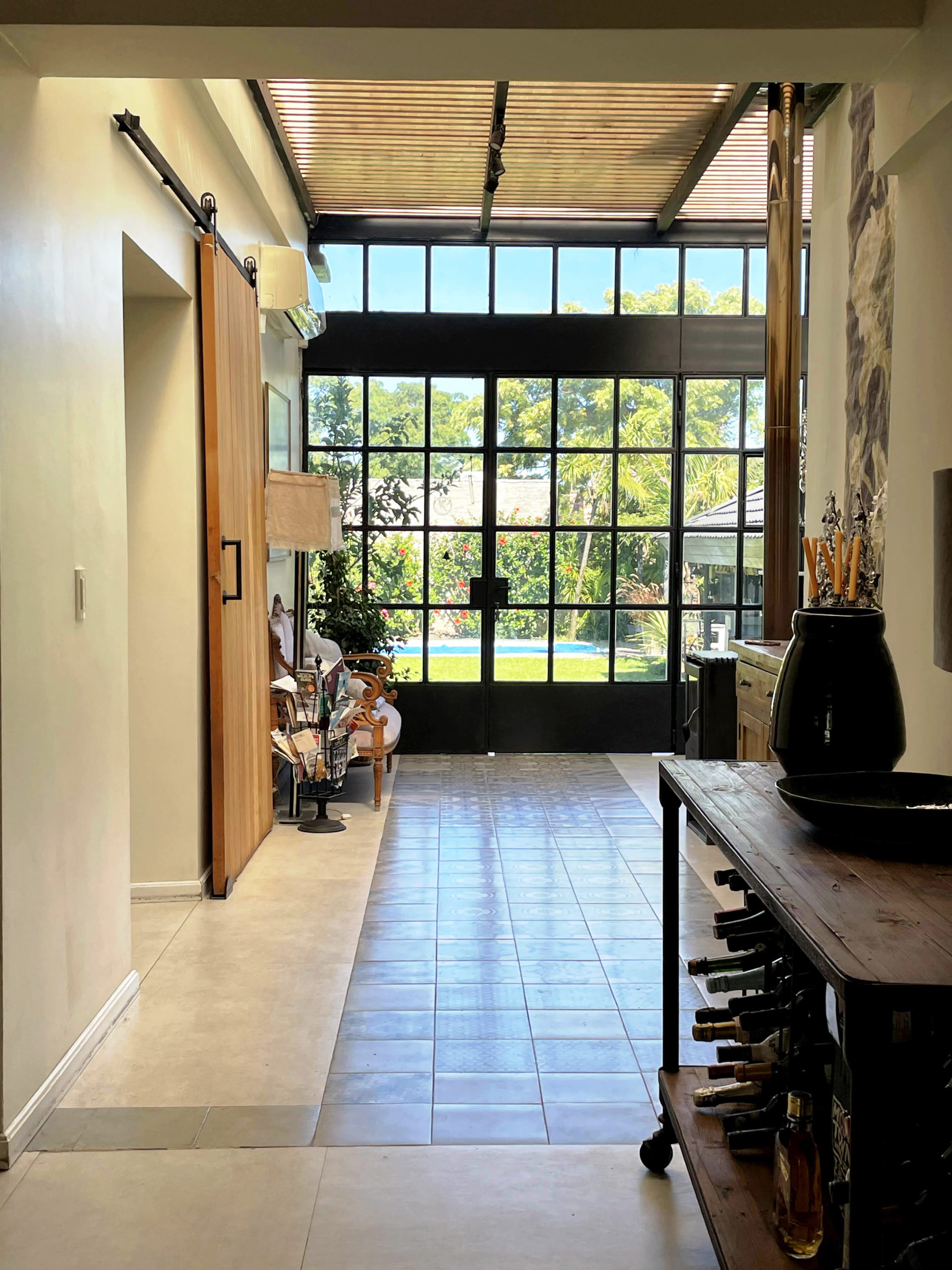 Con el fin de revitalizar el uso de la zona social de la casa, se buscó generar mayor espacio en el living comedor. Para ello, se decidió eliminar la estufa que separaba ambos ambientes. Se amplió la vivienda, generando un patio interior el cual se encuentra anexo al living comedor. Para el techo del patio, se optó por una estructura liviana conformado por una estructura de hierro, madera y policarbonato, para incorporar una luz cenital e iluminar el living comedor existente, ya que este espacio solía recibir poca luz.
